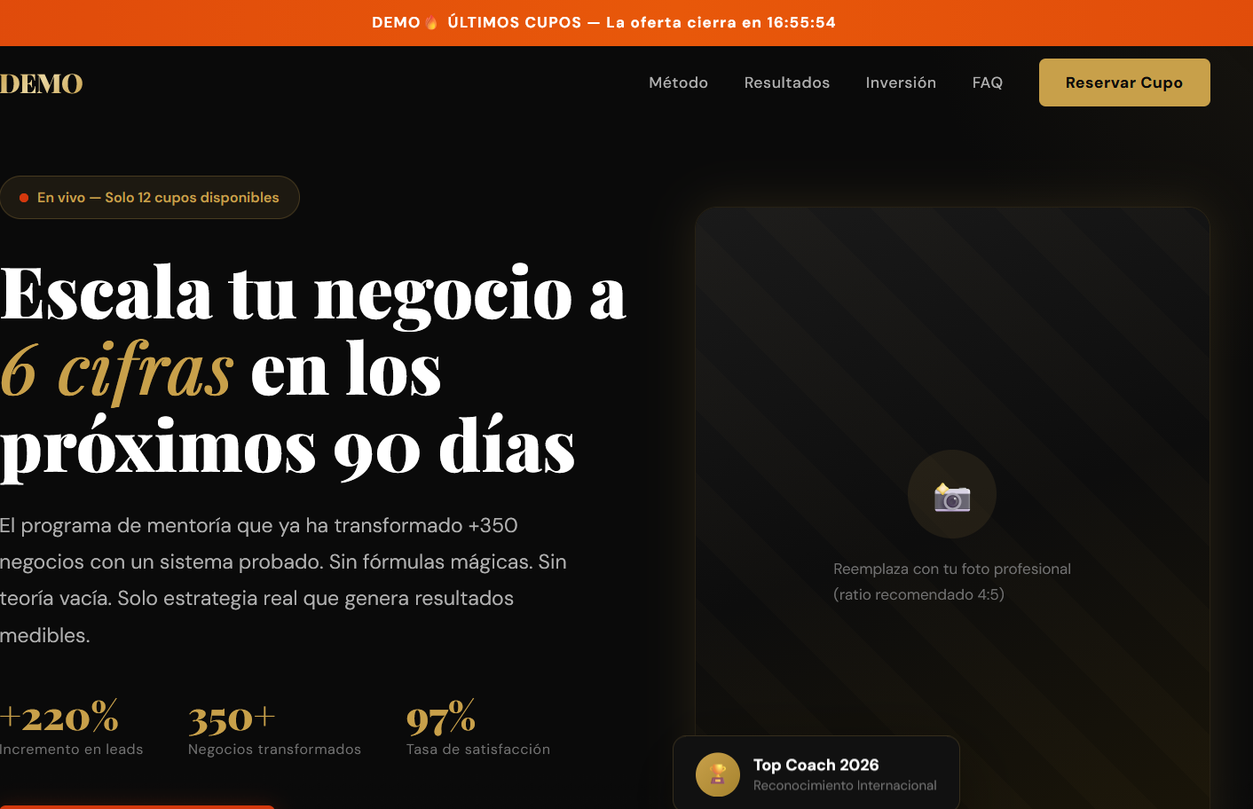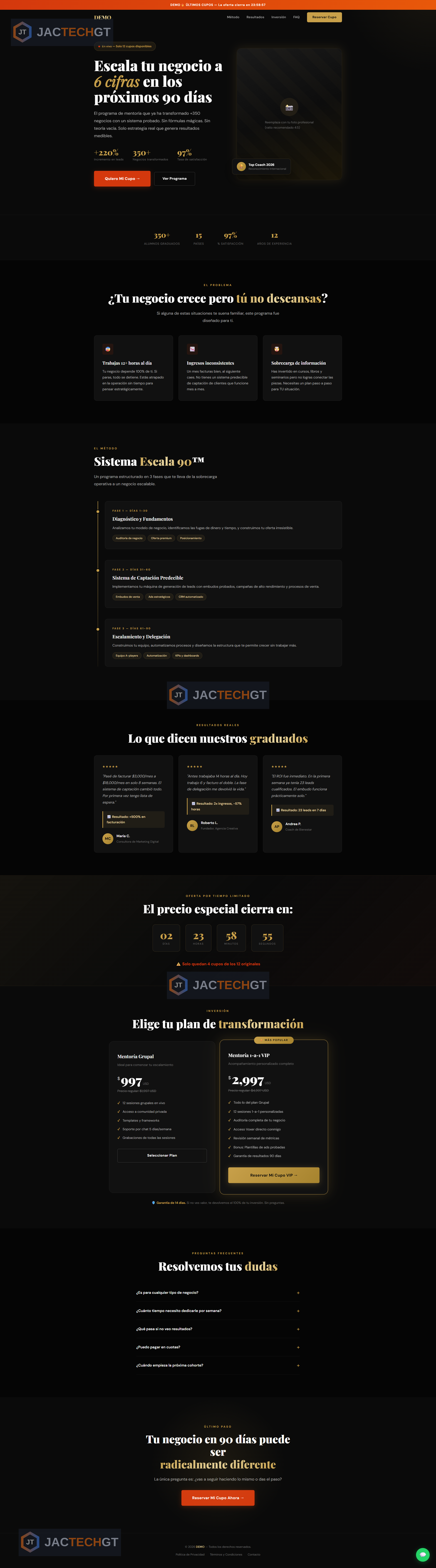 Página de venta para programa de mentoría con countdown, testimonios y pasarela de pago integrada.
